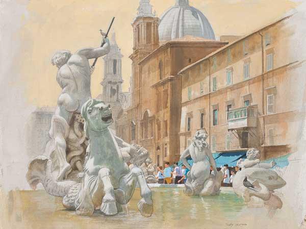 Morning on the Piazza gouache on Arches paper 48 x 40 cm.